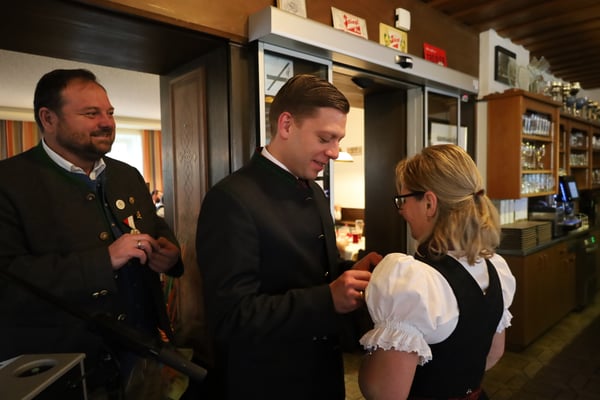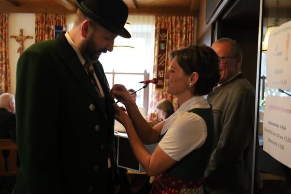 Bürgermeister Robert Bimminger überreichte Obmann Stefan Huber die „Bronzene Ehrennadel“ der Marktgemeinde Eugendorf für sein verdienstvolles Wirken für den Heimatverein D’Vorberger.